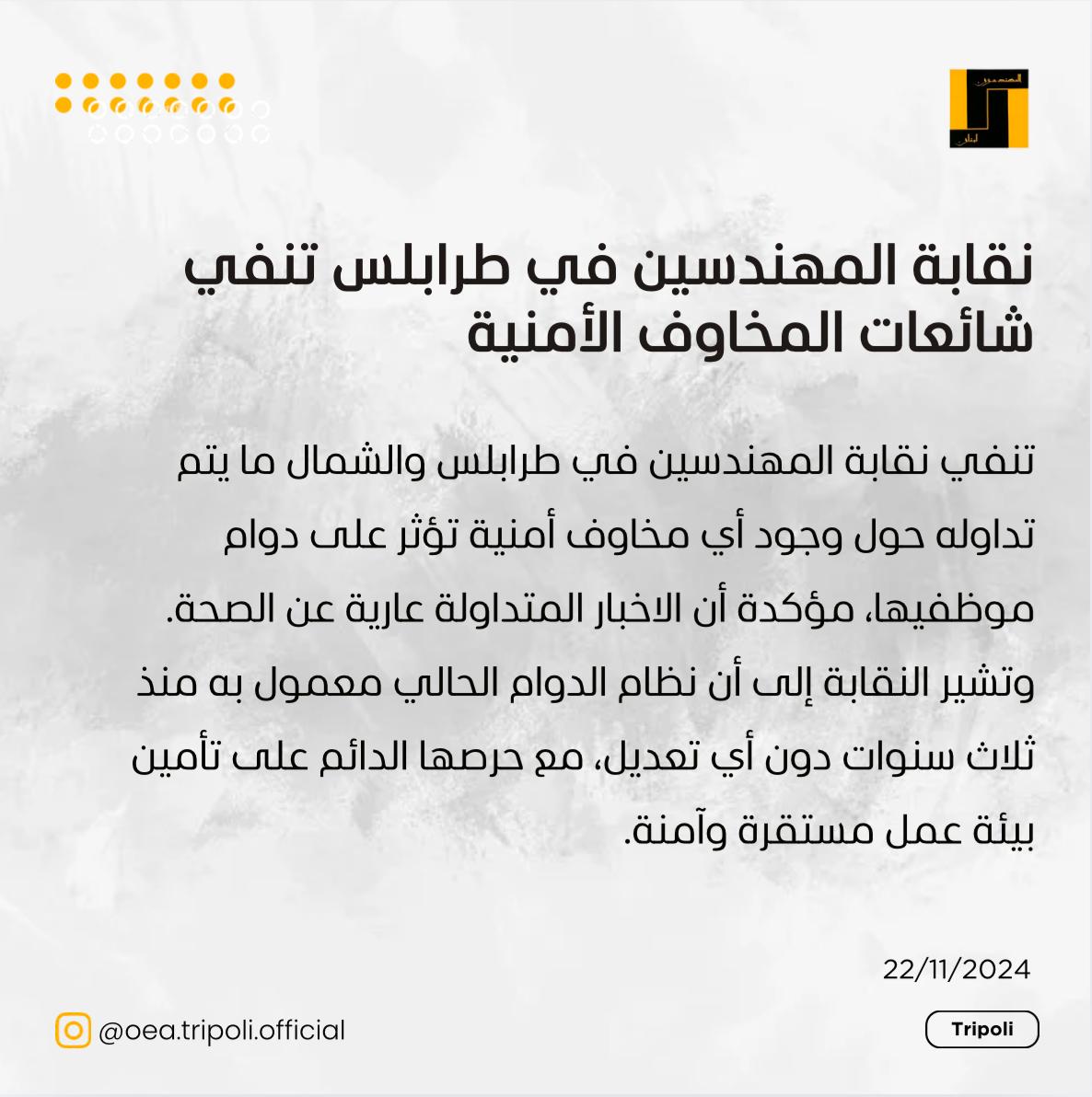 تنفي نقابة المهندسين في طرابلس والشمال ما يتم تداوله حول وجود أي مخاوف أمنية تؤثر على دوام موظفيها، مؤكدة أن الاخبار المتداولة عارية عن الصحة. وتشير النقابة إلى أن نظام الدوام الحالي معمول به منذ ثلاث سنوات دون أي تعديل، مع حرصها الدائم على تأمين بيئة عمل مستقرة وآمنة.